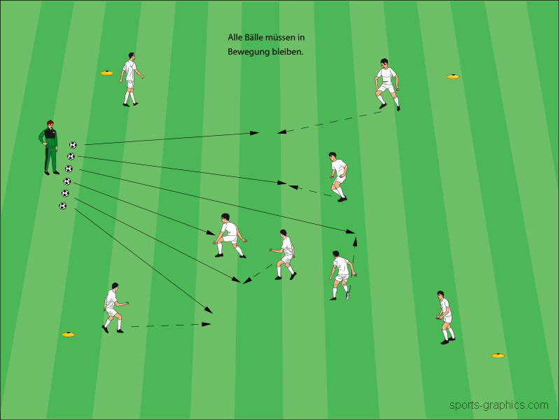 Alle Spieler bewegen sich innerhalb des abgesteckten Feldes. Der Trainer rollt nach und nach Bälle in das Feld. Aufgabe der Kinder ist es nun, alle Bälle in Bewegung zu halten, d. h. die Bälle immer wieder mit dem Fuß oder der Hand anzustoßen, bevor sie liegen bleiben. „Alles bewegt sich – kein Ball darf liegen bleiben!“