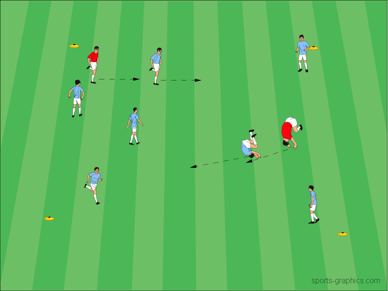 Die Spieler sollten sich vorher orientieren. Besonderer Fokus der Übung liegt auf dem Tempo-/ Rhythmus-Wechsel der Spieler auf dem Weg zum farbigen Feld und auch wieder zurück.