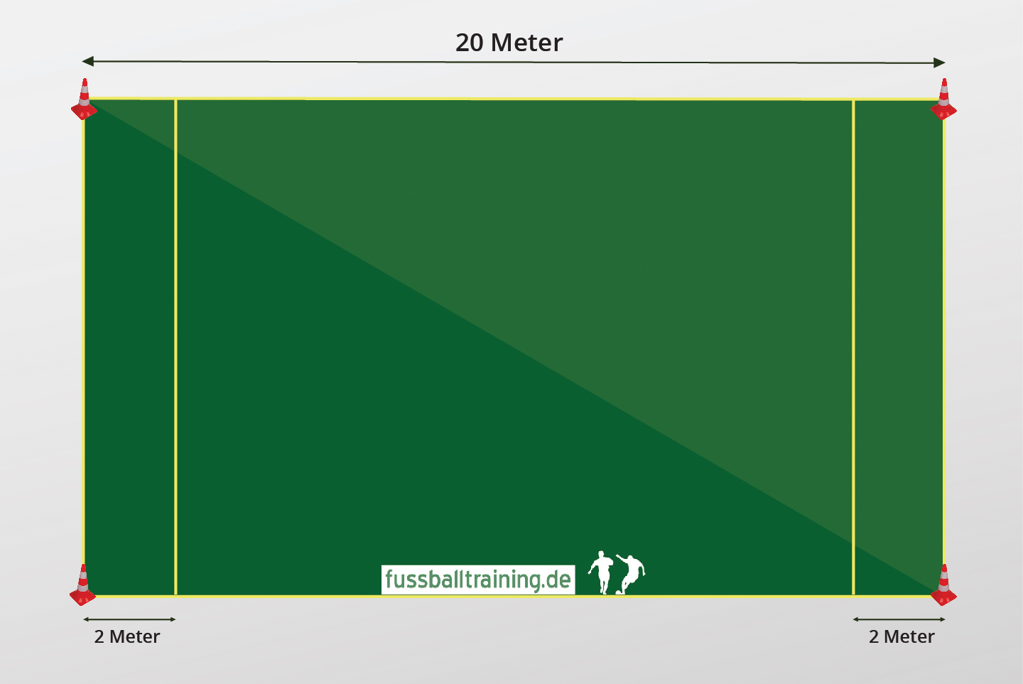 Die Hütchen stecken eine Laufstrecke von exakt 20 Metern ab. Aufgabe der Spieler ist es, die Laufstrecke so oft wie möglich zu absolvieren, also hin- und herzulaufen. Dabei können beliebig viele Spieler nebeneinander laufen und den Test parallel absolvieren. Die Pointe des Shuttle Run Tests ist, dass die zur Verfügung stehende Zeit für diese Aufgabe immer kürzer wird. Dazu kommt die Shuttle Run mp3-Datei ins Spiel, die mittels des unten genannten Links heruntergeladen werden kann. Immer dann, wenn ein Signal ertönt, muss der Spieler die Strecke von 20 Metern zurückgelegt haben. Beim nächsten Tonsignal muss er bereits wieder auf der anderen Seite angekommen sein. Ist er zu schnell, bekommt er am Ende einer Strecke eine kurze Pause, bis das Tonsignal ertönt. Dann läuft er wieder in die andere Richtung. Ist er zu langsam, muss er das Tempo erhöhen, um wieder in den Rhythmus zu finden. Schafft er es dreimal in Folge nicht, mit dem Tonsignal auf der Ziellinie zu sein, scheidet er aus. Umso mehr Level ein Spieler schafft, umso fitter ist er.