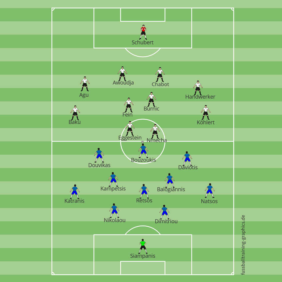 Die U21 Auswahl aus Griechenland agierte mit dem Ball in einem 4-3-3. Der Spielaufbau wurde über die 4er-Kette gespielt. Hierbei suchten die Griechen sehr schnell die vertikalen Bälle in die Schnittstellen der deutschen Abwehrreihe.
