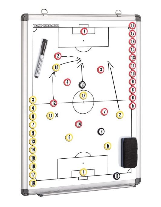 Da die bekannte Video-Analyse das Budget und die zeitlichen Ressourcen, gerade im Amateurfußball, deutlich sprengen dürfte, sehen wir in diesem Artikel von dieser Alternative mal ab. Das vermutlich wichtigste und effizienteste Hilfsmittel eines Trainers ist das Taktikboard oder auch Taktiktafel genannt. Anhand einer Taktikttafel lässt sich nicht nur die Aufstellung auf Spielfeld „übertragen“, sondern auch bestimmte Laufwege oder das Verhalten in bestimmten Spielsituationen „maßstabsgetreu“ auf das Fußballfeld übertragen. Wer in seiner Kabine keinen Platz für eine Taktiktafel hat oder diese zu Auswärtsspielen nicht mitschleppen will, kann auf die „leichtere“ Version der Taktikfolie zurückgreifen. Diese lässt sich leicht aufhängen und kann im Anschluss genau wie eine normale Taktiktafel verwendet werden. Darüber hinaus ist eine Taktikfolie etwas preiswerter im Vergleich zum Taktikboard oder zur Taktiktafel und kann ebenso wie ihr Pendant mehrmals verwendet werden (wasserlösliche Eddings/Filzstifte verwenden!).