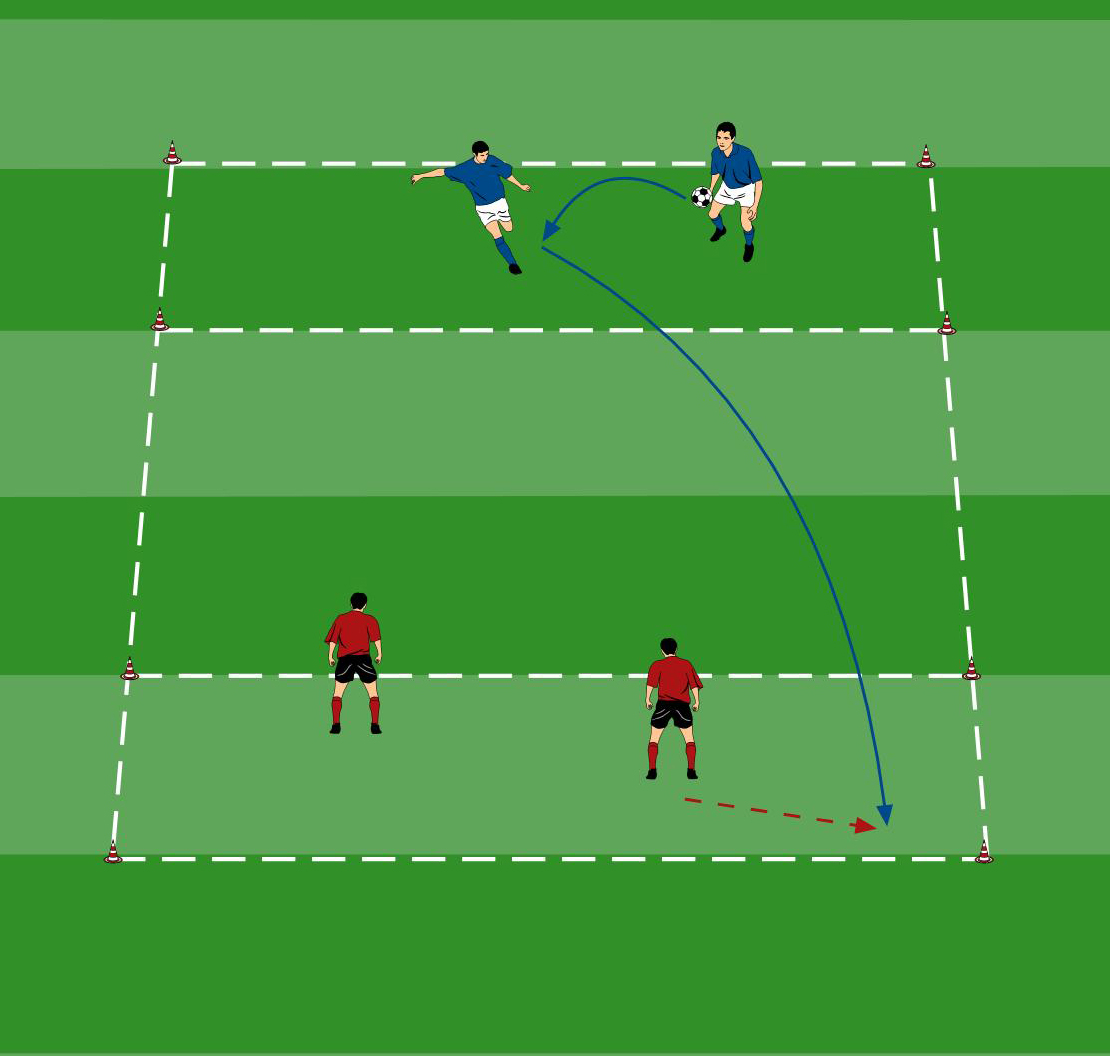 Das kleinste Spielsystem, das im Training stattfinden kann, ist das 2er-System im 2-gegen-2 oder im 2-gegen-3. Selbstverständlich ist die hier geforderte Zusammenarbeit zweier Spieler genau so ins 11-gegen-11 übertragbar. In dieser Einheit können die Spieler das Spielverhalten zu zweit lernen, in den nächsten Montagseinheiten wird dies bis zum 11-gegen-11 gesteigert.