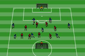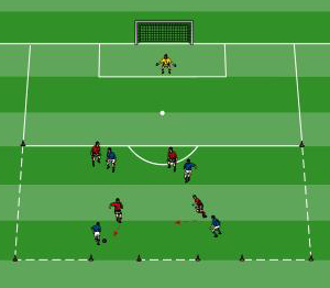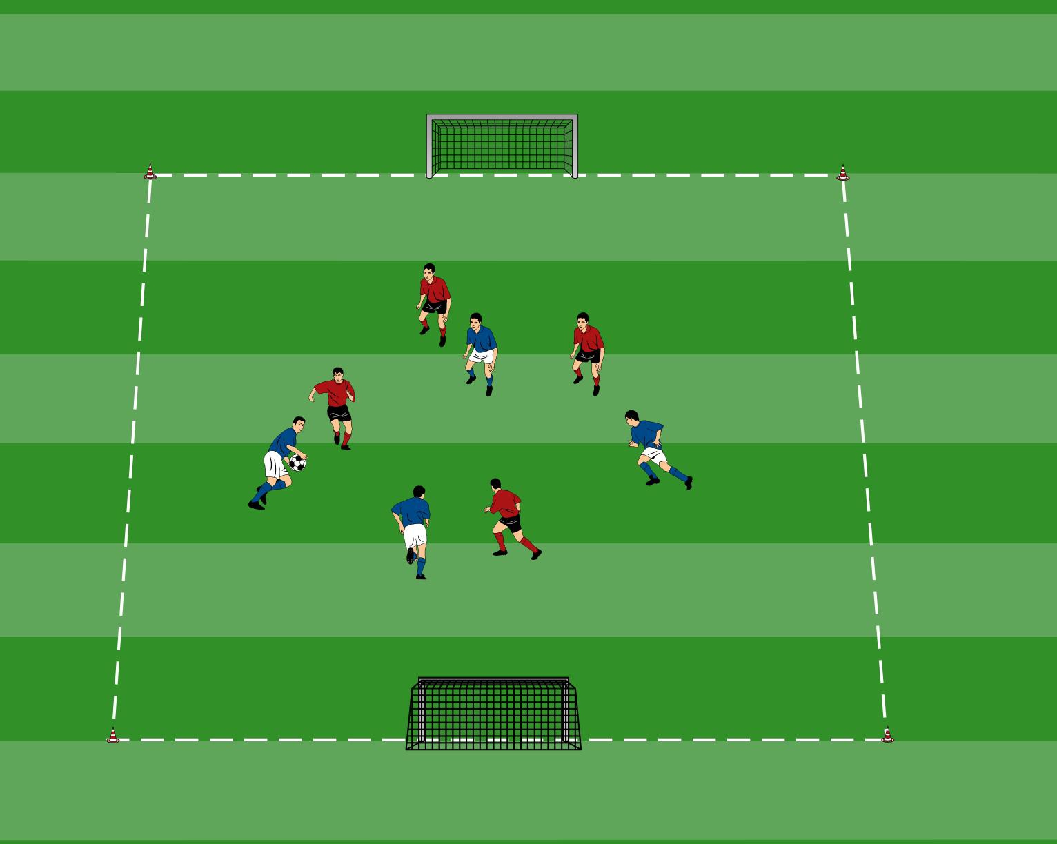 • Die Viererteams zu zwei 8er-Mannschaften zusammenfügen und im halben Feld auf zwei Großtore mit Torhütern spielen lassen.