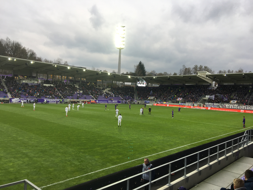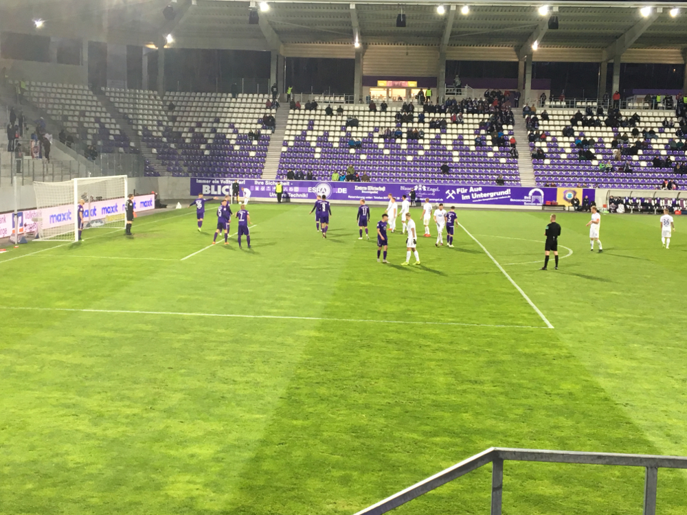Die Veilchen versuchten im 1-4-3-1-2, den Ball zurück zu erobern. Mit einer Art 10er sollte der abkippende 6er der Auer dynamisch verteidigt werden. Beide Stürmer liefen agiert an, um den Spielaufbau auf einer Seite zu fixieren. Die Probleme traten meist auf, wenn (A) eine Seite, vor allem rechts, durch den AV überlagert wurde und dann hinterlief dieser oft, um Eingaben zu bringen.