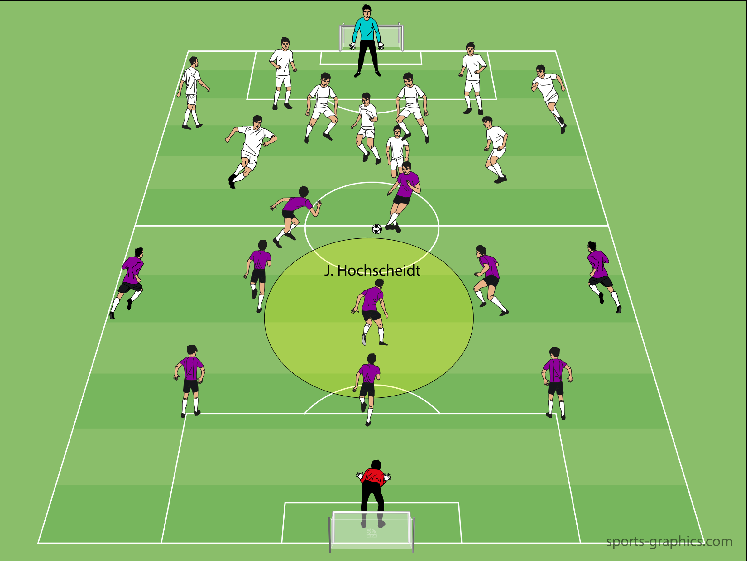 Eine spezielle Rolle hat Jan Hochscheidt, dieser bewegt sich als „Freigeist“ überall, mal auf der 10, dann 8er aber auch mal Außen am Flügel. Dadurch entzieht er sich oft dem direkten Zugriff und kann kreative Impulse für das Spiel geben.