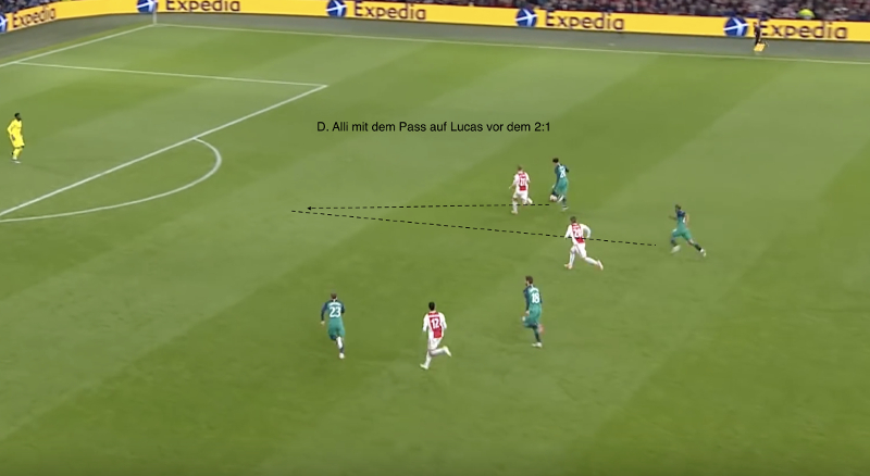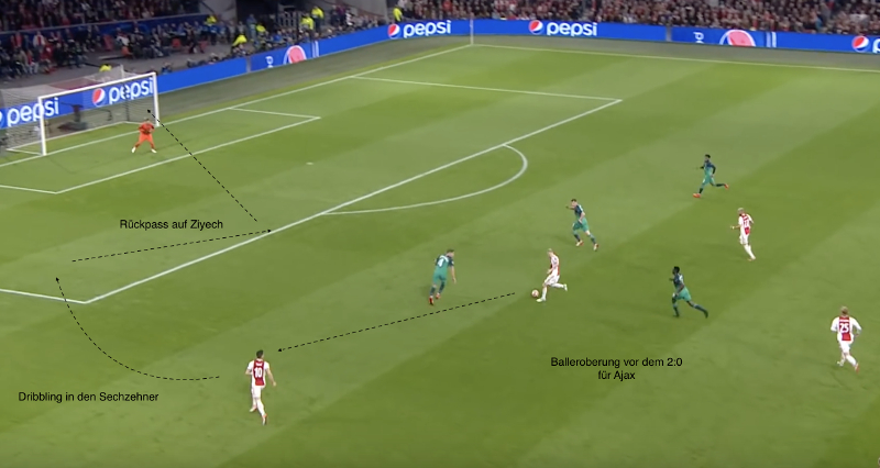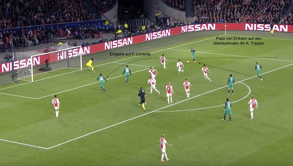 Dabei wusste sich jedoch Amsterdam immer wieder zu befreien, indem sie vor allem die aufgehenden Räume hinter den Außenverteidigern der Spurs nutzten, oder durch schnelle kurze Pässe die Seite verlagern konnten.