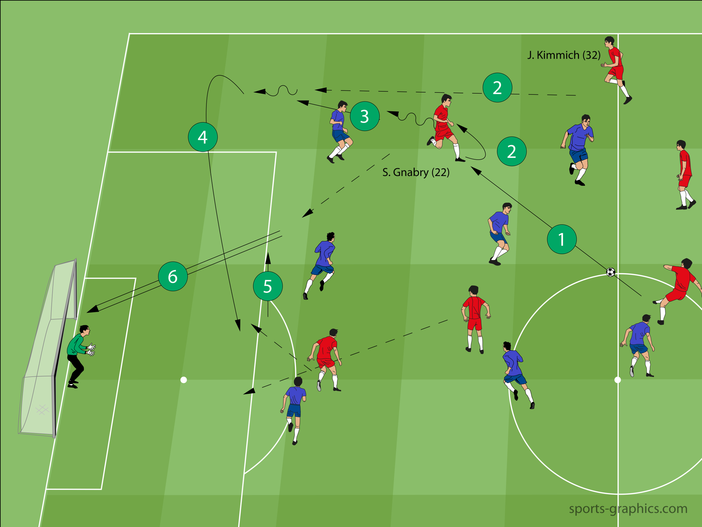 Der FC Bayern hat im Mittelfeld neben den zentralen Spieler mit S. Gnabry (22) und K. Coman (29) zwei Flügelspieler aufgeboten, welche neben ihrer Kreativität und Schnelligkeit auch einen Drang in die Tiefe mitbringen. Die beiden offensiven Flügelspieler arbeitet engagiert beim Einrücken in die Halbräume im Mittelfeld.