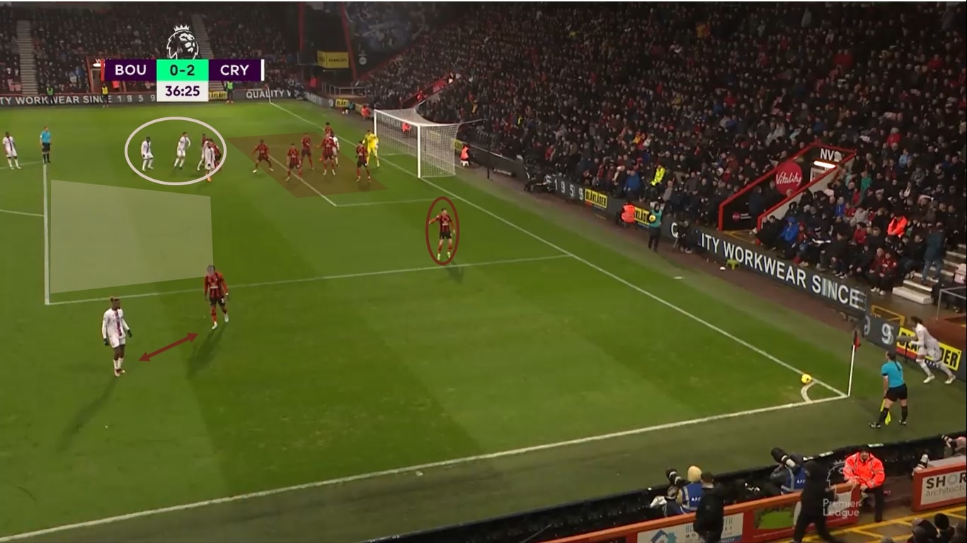 Man erkennt vor der Eckballausführung, dass Bournemouth vor dem eigenen Tor nur den Raum verteidigt. Im Gegensatz zu Liverpool aus dem ersten Beispiel, ziehen sie einen weiteren Spieler mit zur Ecke hin, um eine Unterzahl am Flügel zu verhindern und gleichzeitig eine halbhohe Flanke auf den ersten Pfosten abfangen zu können. Die Abwehr steht dabei im Strafraum recht tief. Crystal Palace hat nur einen Spieler im Fünfmeterraum positioniert.