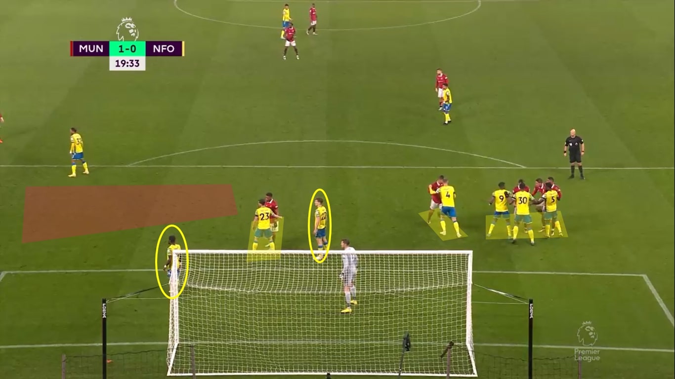 Außerdem stehen vier Spieler zum Einlaufen auf Höhe des Elfmeterpunkts bereit. An der Strafraumkante auf der Seite, auf der die Ecke ausgeführt wird, ist ein sehr großer freier Raum. Was in diesem Standbild noch nicht deutlich wird, ist, dass im Rückraum zwei Spieler von Crystal Palace ohne Gegenspieler auf mögliche Abpraller spekulieren.