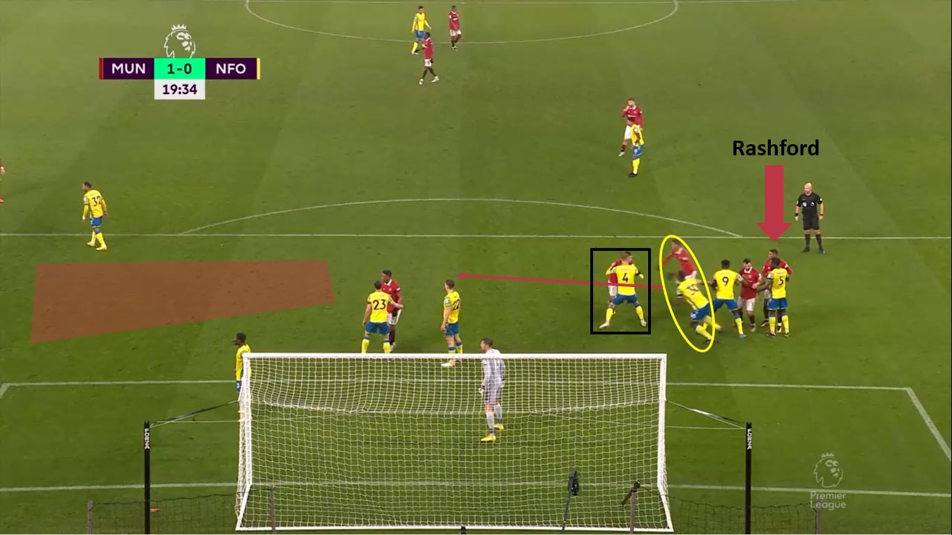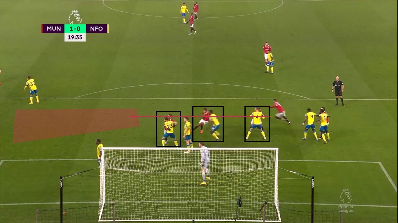 Man erkennt jetzt, dass Casemiro seinen Laufweg in die freie Zone abgebrochen hat. Nun stellen alle drei zentralen Spieler einen Block, um die Laufwege der Verteidiger verhindern zu können. In diesem Moment kann Rashford von ganz hinten auf Höhe des Elfmeterpunktes in den freien Raum nach vorne dringen und so seinen Gegenspieler überraschen und ihm davonlaufen.