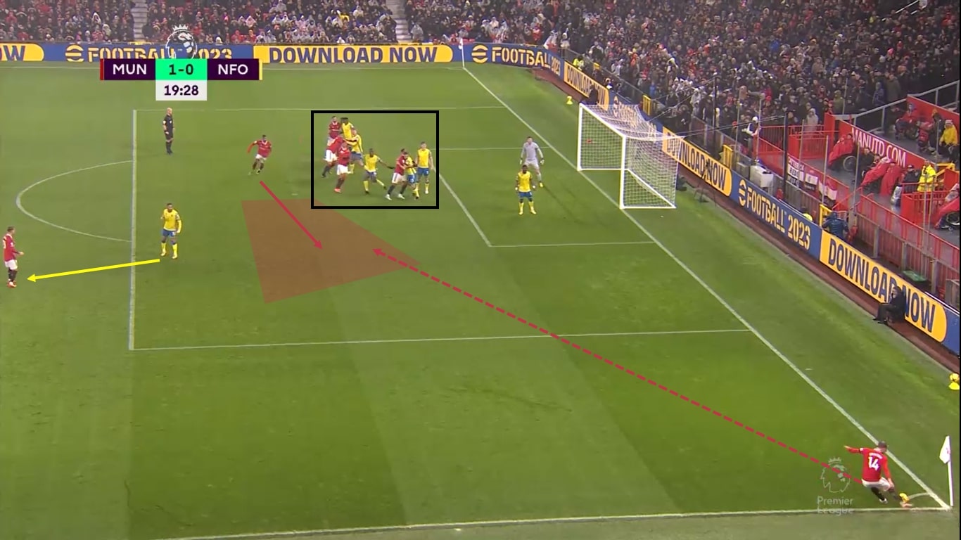 Im letzten Beispiel dieses Beitrags wird eine ähnliche Variante wie in Beispiel zwei vorgestellt. Manchester United konnte durch dieses Tor den Weg für einen Sieg im Spiel gegen Nottingham Forrest ebnen. Wie im Beispiel zuvor wird die Ecke wieder weder kurz ausgeführt, noch als Flanke geschlagen. Der Unterschied liegt hierbei zum einen in dem Raum, wo die flache Hereingabe einen Abnehmer findet und zum anderen in der Freilaufbewegung der Angreifer. Diese kann im Folgenden sehr gut anhand der Bilder beschrieben werden.