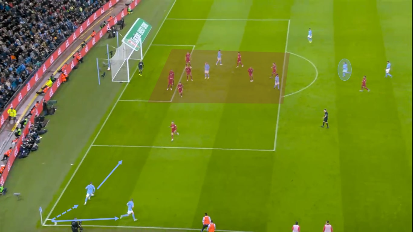 Im Spiel zwischen Manchester City und dem FC Liverpool vom 22.12.22 im englischen Pokal konnte die Mannschaft von Pep Guardiola das Spiel durch einen Treffer nach einer Ecke für sich entscheiden und somit in die nächste Runde einziehen. Ein weiteres Argument dafür, dass Trainer sich mehr mit Eckballvarianten beschäftigen sollten, um somit die Chancen auf eigene Erfolge auch in engen Partien zu erhöhen. Ausgangslage in der vorliegenden Spielszene ist, dass Kevin de Bruyne eine Ecke herausholen kann. Er läuft anschließend direkt weiter, um zuerst den Ball einsammeln zu können und dann die Ecke schnell ausführen zu können. So kann Manchester City die Unordnung in der gegnerischen Abwehr ausnutzen.