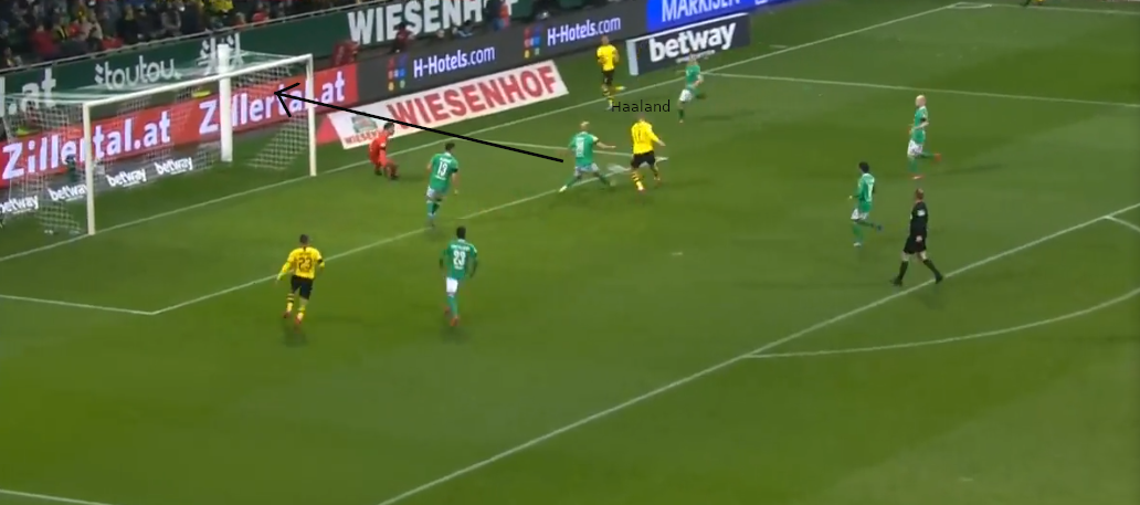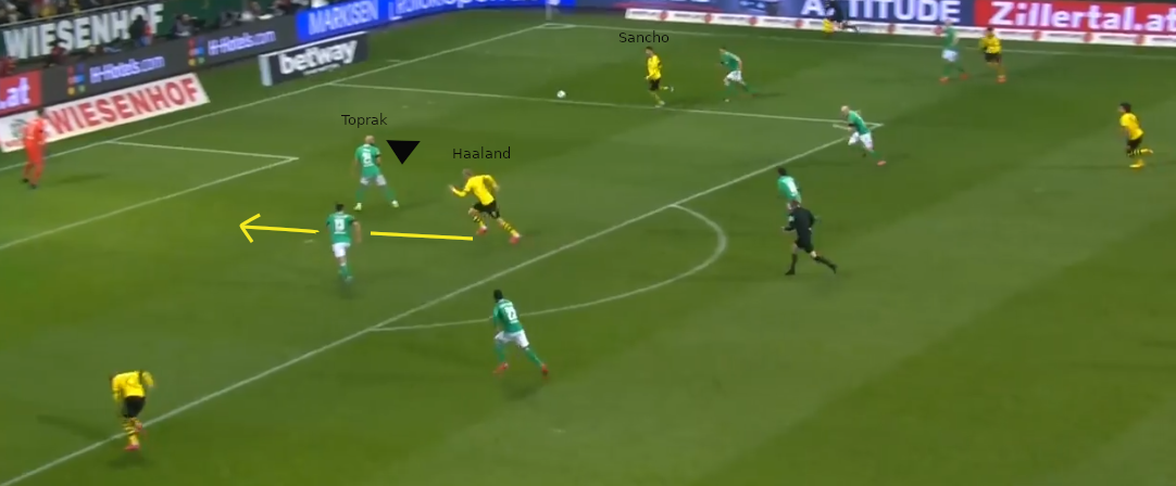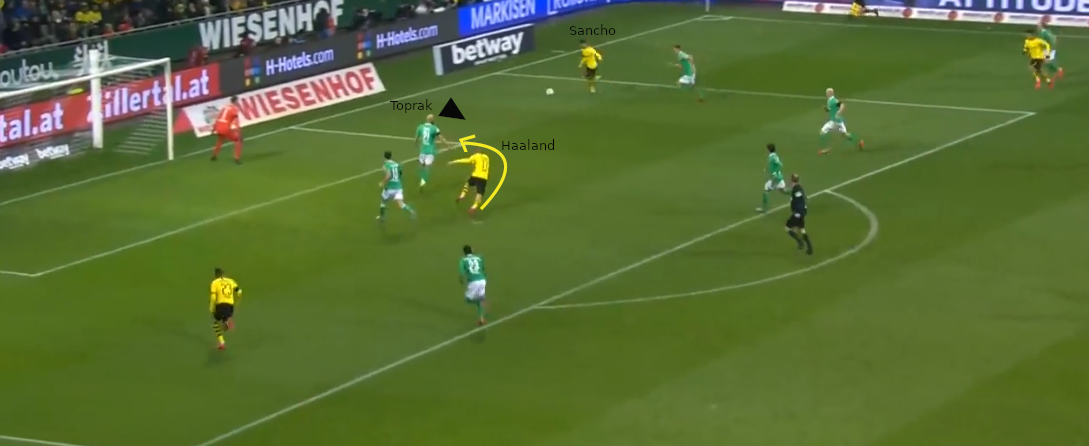 Ausgangssituation: Sancho wird mit einem Pass in Richtung Grundlinie bedient und steht unmittelbar vor einer Hereingabe. Im Strafraum befinden sich 2 Verteidiger von Bremen und Haaland. Ein der beiden Abwehrspieler ist Toprak. Dieser hat Haaland im Blick, welcher vermeintlich die Lücke zwischen den beiden Verteidigern anläuft.