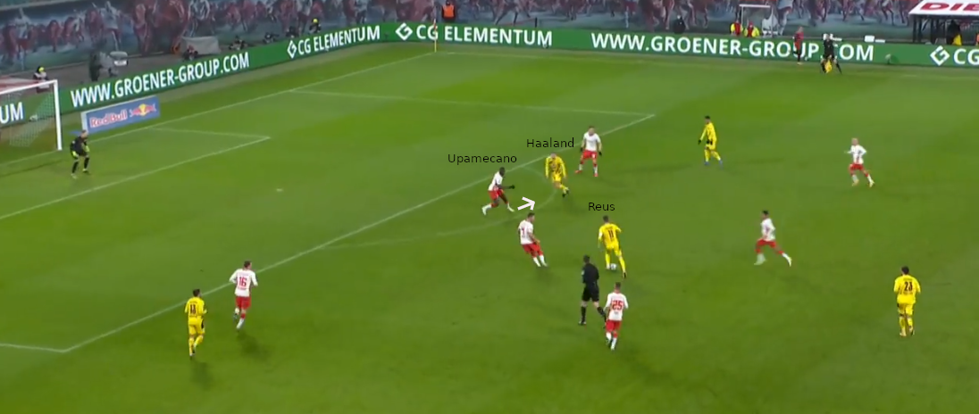 - Haaland beläuft den Raum im Rücken von Upamecano. Dadurch muss der Innenverteidiger erst abdrehen und hat somit kein Zugriff mehr auf den Stürmer vom BVB.