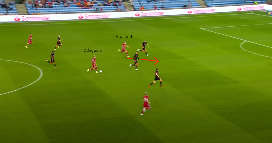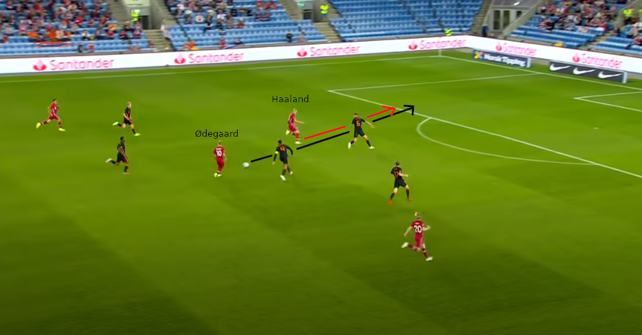Ødegaard spielt einen Pass in den Lauf von Haaland. Zum Zeitpunkt des Passes steht der Abwehrspieler in der Nähe des Angreifers mit dem Rücken zum Ball. Folglich muss dieser erst wieder abdrehen und verliert dadurch Zeit.