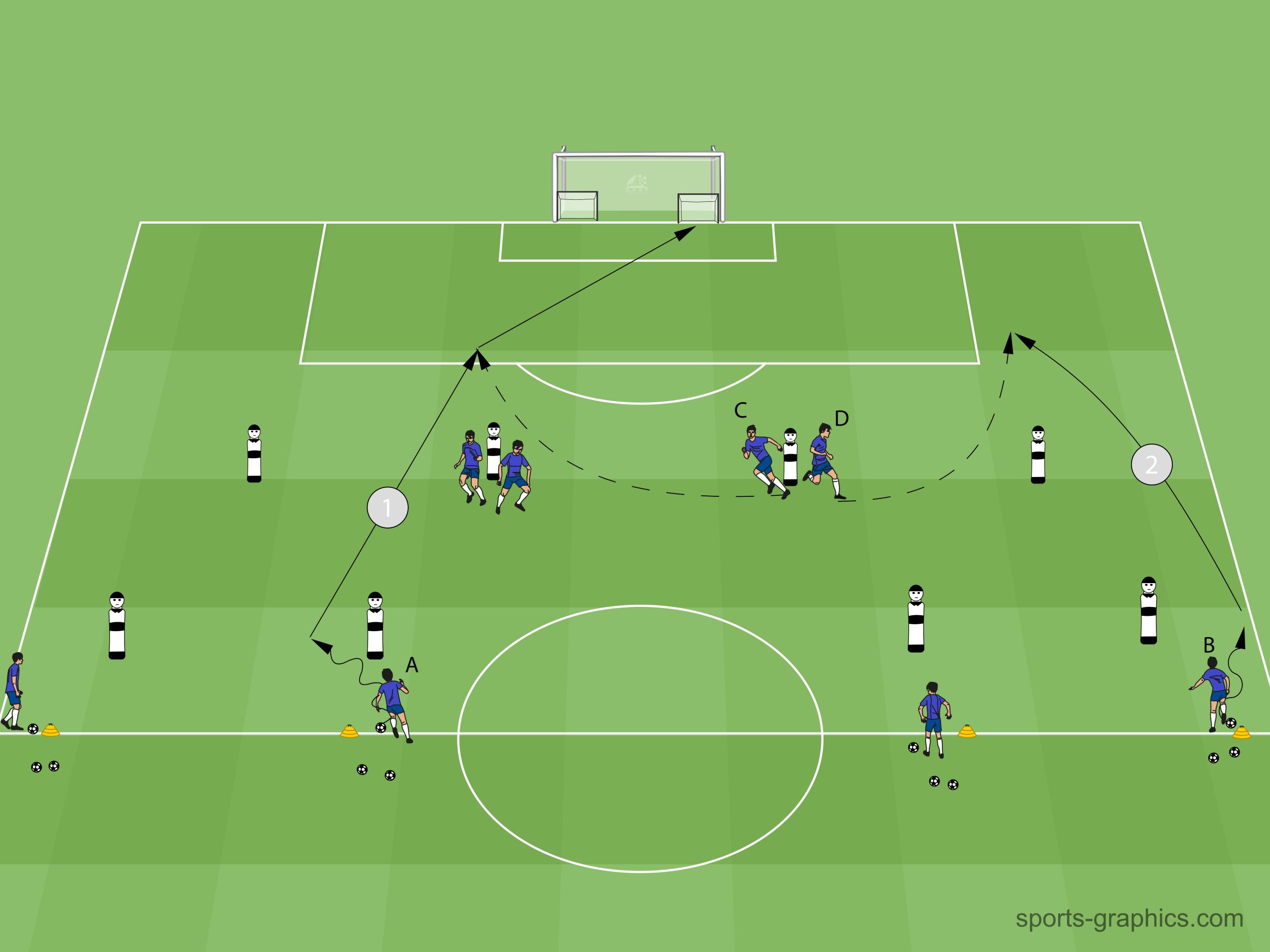 Spieler A passt zu Spieler C, welcher im Bogenlauf in die Tiefe startet. Spieler B geht mit einer Finte innen am Dummy vorbei und passt durch die Schnittstelle zu Spieler D. Sowohl Spieler C und D passen in das ballferne Tor.