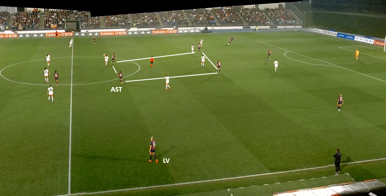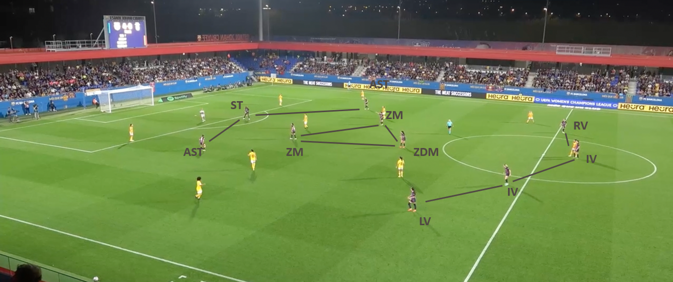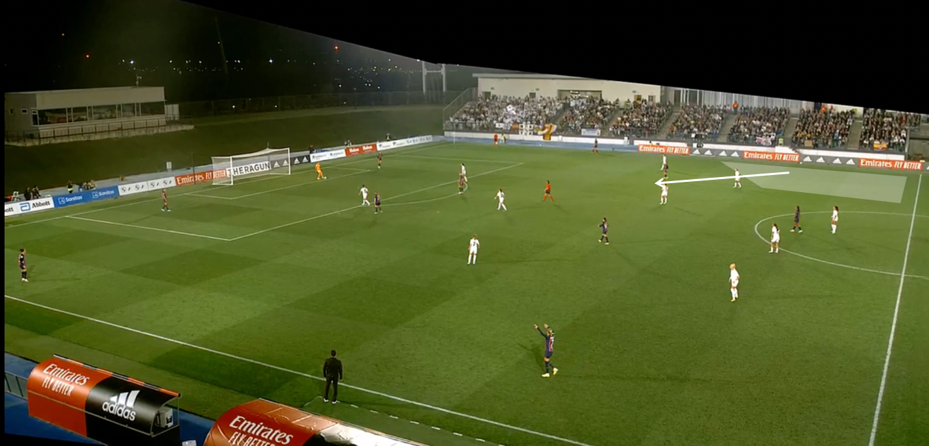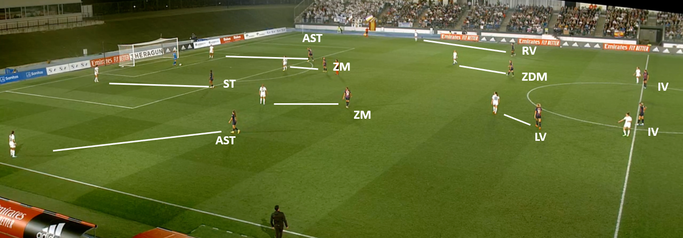 In der Abbildung lässt sich ein üblicher Ablauf von Barcelona bei eigenem Torabstoß erkennen. Es fällt auf, dass es sich um eine asymmetrische Positionierung handelt. Die beiden Außenverteidigerinnen bieten sich flach an. Die linke 8 fällt neben die 6, um eine Doppelsechs vor dem eigenen Strafraum zu haben. Die linke Außenstürmerin rückt ein und füllt den Raum der linken 8. Dadurch ist der linke Flügel unbesetzt.