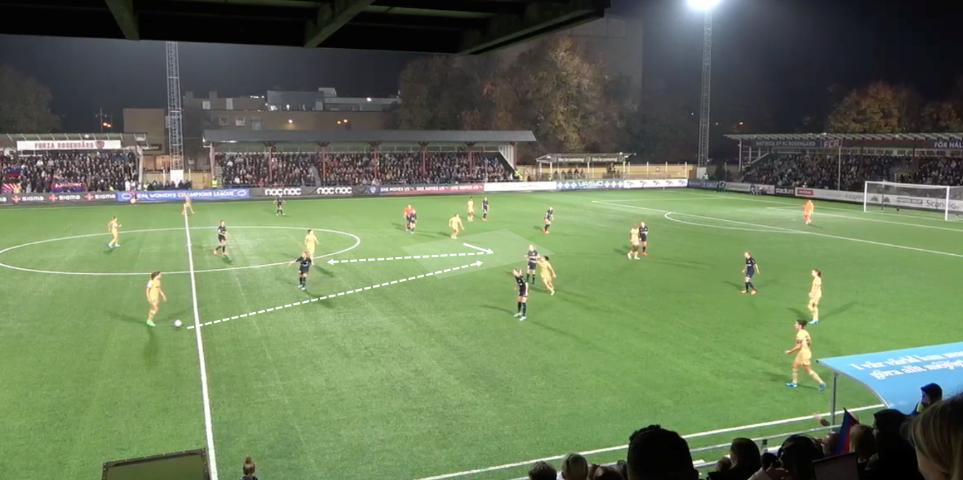 Da sie durch ihre technisch starken und pressingresistenten Spielerinnen im Zentrum profitieren, können sie das Mittelfeld mit kurzen Passdistanzen und Dreiecksbildungen schnell und oft auch sicher überspielen.