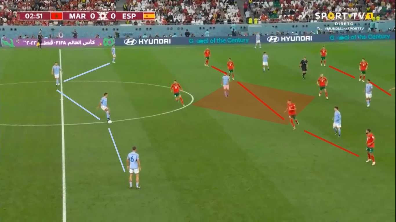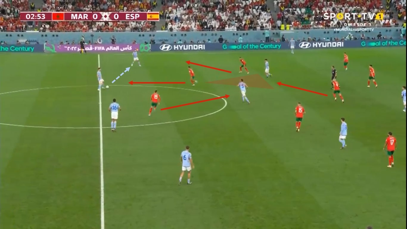 Im ersten Bild sieht man gut, wie Busquets in dieser gegnerischen Raute eingeschlossen ist. Gleich zu Beginn des Spiels ließ Spanien den Ball durch die eigenen Reihen laufen, um sich den Gegner zurecht zu legen. Während der marokkanische Stürmer sich darauf beschränkte, dass Busquets den Ball nicht bekommt, liefen die beiden zentralen Mittelfeldspieler den jeweiligen Innenverteidiger auf der Seite an. In ihrem 4-1-4-1 System hatten sie mit Amrabat als defensiven Mittelfeldspieler jemanden, der auf der ganzen Breite vor der Abwehr für weitere Sicherheit sorgen konnte.