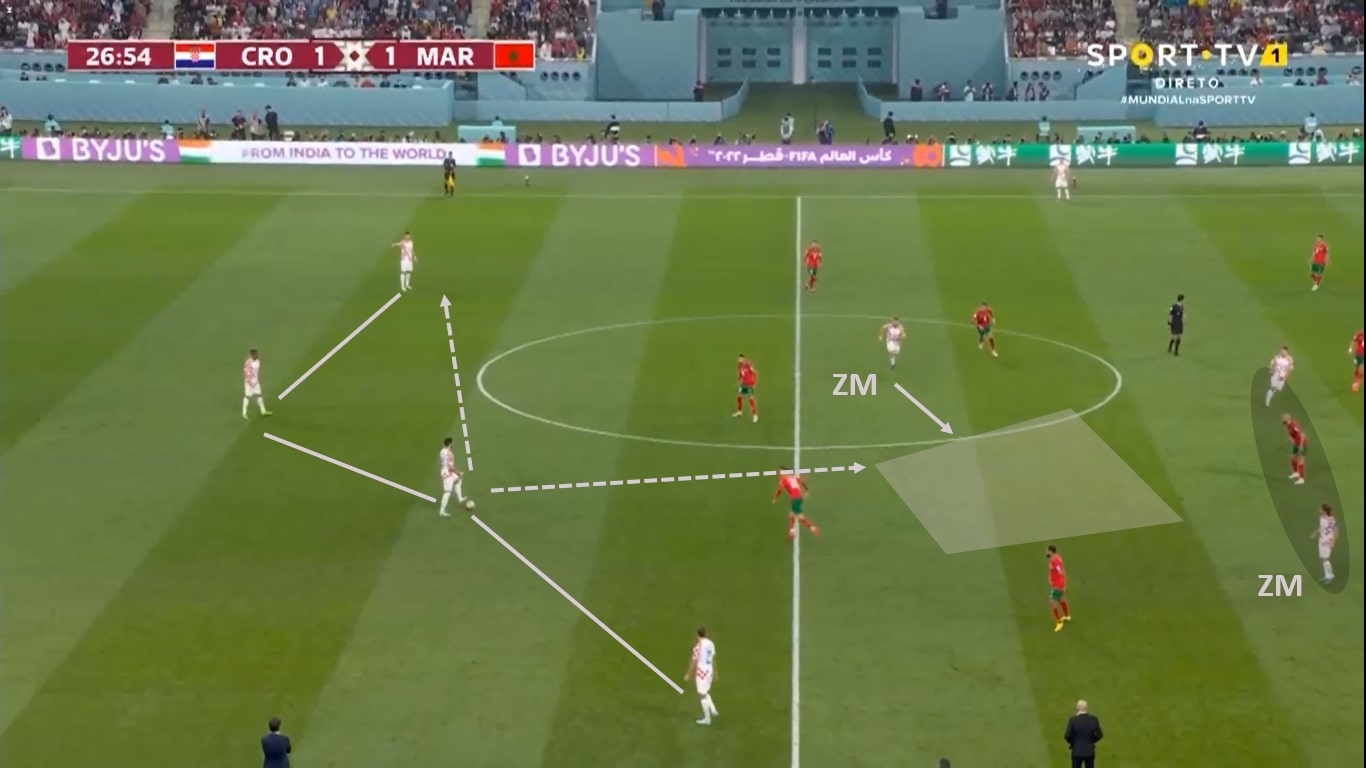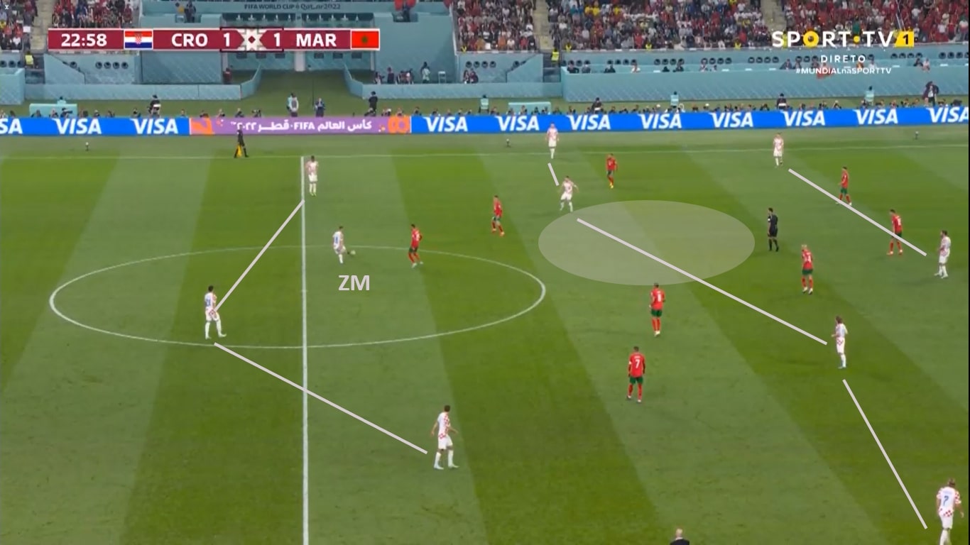 Die restlichen kroatischen Offensivspieler bewegen sich fast alle bis zur letzten Linie. Man sieht die bewusste Überlegenheit auf den Flügelpositionen, wie in diesem Fall auf dem linken Flügel. Da die Kroaten mit Modric und Kovacic Spieler in den eigenen Reihen haben, die präzise lange Bälle auf die Außen und hinter die Kette spielen können, versuchen sie, dieses Mittel zu nutzen. Auf diese Weise können sie das Mittelfeld überspielen und gleichzeitig die Chance verringern, dass Marokko durch Fehlpässe im Mittelfeld umschalten kann. Diese Variante, bei der beide zentralen Mittelfeldspieler tief im eigenen Spielaufbau stehen, war eine der verschiedenen Möglichkeiten, die die Kroaten zu nutzen versuchten.