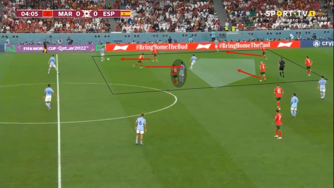 Gegen die ballbesitzliebenden Spanier standen sie kompakt in der eigenen Hälfte in einem 4-1-4-1 bzw. 4-5-1 System. Dabei lag vor allem der Fokus darauf, die drei kreativen Mittelfeldspieler Pedri, Gavi und Busquets aus dem Spiel zu nehmen. Durch das Unterstützen des eigenen Stürmers konnten sie im Mittelfeld eine Überzahl schaffen und so den Spielaufbau der Spanier durch das Zentrum unterbinden. Sie ließen den Ball bei den spanischen Verteidigern laufen und setzten diese nur selten unter Druck. Busquets als wichtiger Teil des spanischen Aufbauspiels stand während dem Spielaufbau eingeschlossen in einer Raute zwischen Stürmer, defensivem Mittelfeldspieler und den beiden anderen zentralen Mittelfeldspielern. Der marokkanische Stürmer arbeitete hierbei sehr viel mit seinem Deckungsschatten, in dem er Busquets markieren konnte.