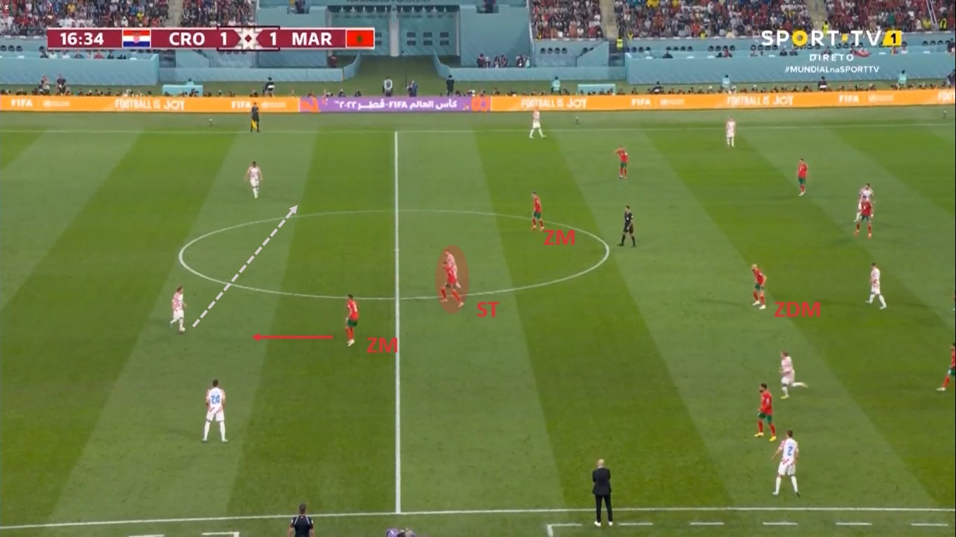 Auf dem nächsten Bild sieht man die Folgeszene zur vorherigen. Der marokkanische Stürmer versucht, den gegnerischen zentralen Mittelfeldspieler zu markieren. Der linke zentrale Mittelfeldspieler, der gerade angelaufen ist, lässt sich in die Mittelfeldreihe zurückfallen. Im Gegenzug läuft der rechte zentrale Mittelfeldspieler auf den gegnerischen Innenverteidiger zu, um ihn nach außen zu lenken. Dabei ist der rechte äußere Mittelfeldspieler bereits auf den Pass zum gegnerischen Außenverteidiger vorbereitet. Der rechte zentrale Mittelfeldspieler Marokkos hat den kroatischen ZM weiterhin in seinem Deckungsschatten, während er auf den linken Innenverteidiger zuläuft.
