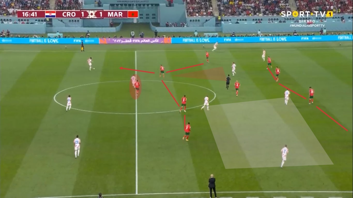 Wenn einer der beiden zentralen Mittelfeldspielern den gegnerischen Innenverteidiger angelaufen ist, konnte der anlaufende Spieler ebenfalls mit seinem Deckungsschatten den Gegenspieler hinter ihm markieren. Bewegte sich der gegnerische zentrale Mittelfeldspieler aus dem Deckungsschatten heraus, konnte dieser von Amrabat angelaufen werden. Dabei war es Marokko wichtig, dass dieser sich nicht drehen kann und direkt bei Ballannahme gestört wird. So konnten die überspielten Spieler nachrücken und die Defensive verstärken.