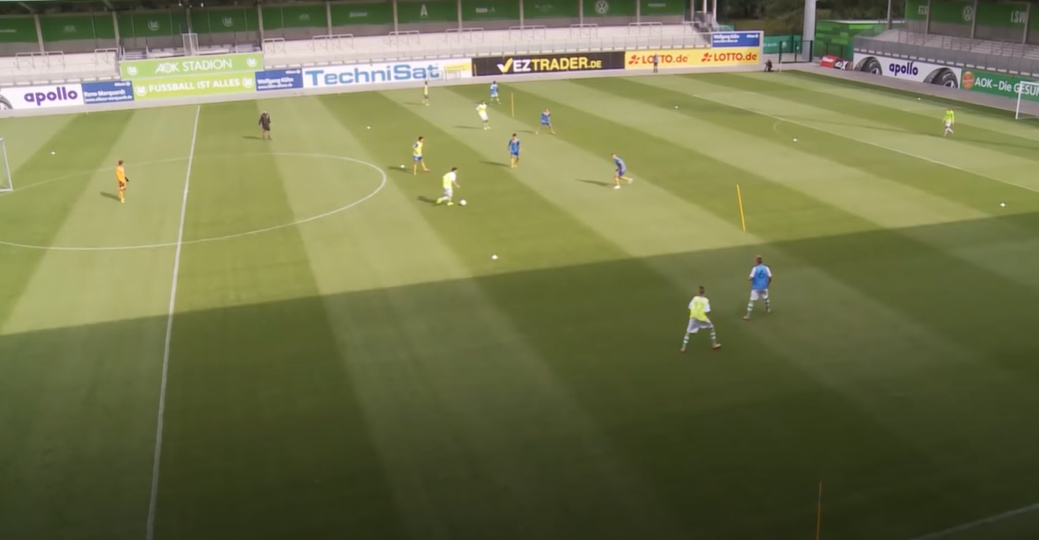 Der zweite Hauptteil der Trainingsübung besteht aus einer Spielform und 3 Zonen, auf ein Halbfeld. In der Mittelzone findet ein 3 gegen 3 statt. Auf den Außenzonen jeweils ein 1 gegen 1. Die Spieler müssen in den Zonen bleiben. Das ermöglicht den weiteren Fokus auf die 1 gegen 1 Situation.