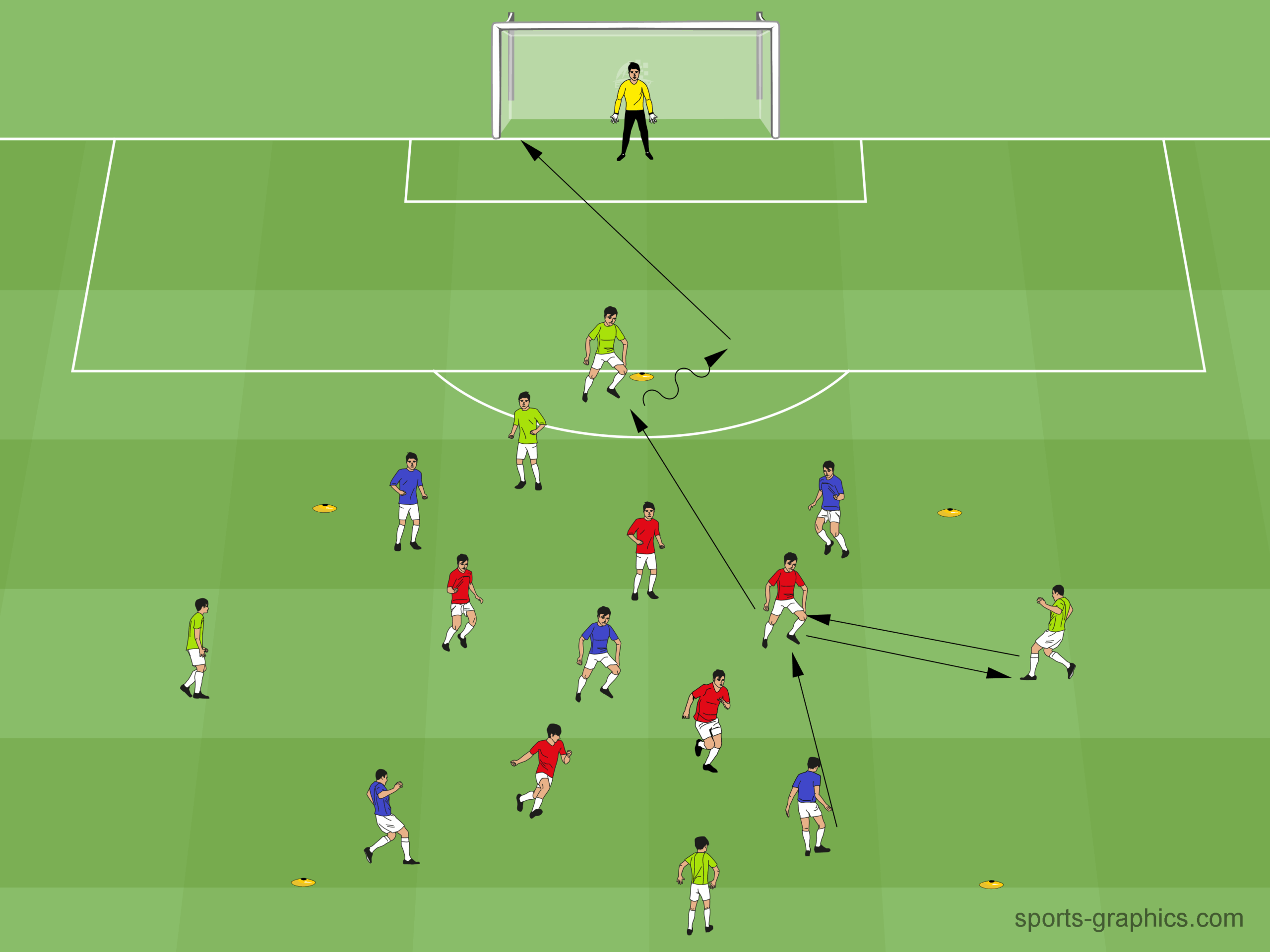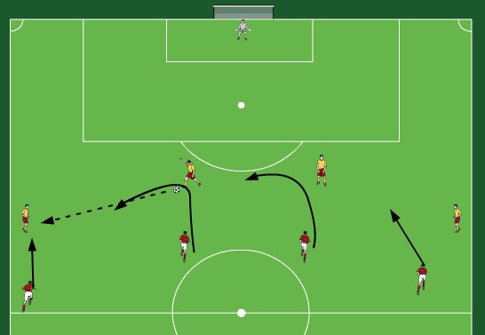 4 Muldenhauben werden in Form eines Vierecks aufgestellt. 1 Muldenhaube wird auf Höhe des Strafraumes gelegt, wo 1 Spieler steht. Im Viereck findet ein 5-gegen-5 statt, außerhalb stehen 4 Anspieler. Die verteidigende Mannschaft muss den Ball erobern und einen Doppelpass mit dem Mitspieler spielen. Ist dies gelungen, darf auf den einen Spieler am Strafraum gepasst werden. Dieser dreht sich auf und schließt ab.