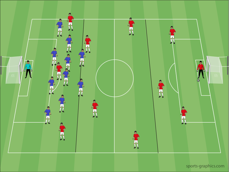 Aber auch bei einem System mit sehr wenigen Innenverteidigern wie beispielsweise dem 3-5-3 System stellen sich schwerwiegende Probleme ein. Hier ist das Druckspiel zwar in wesentlich mehr Situationen möglich, aber dafür besitzt das Team gerade einmal drei Innenverteidiger, die als letzte Absicherung dienen, wenn das Druckspiel fehlschlägt. In der Regel ist das zu wenig.