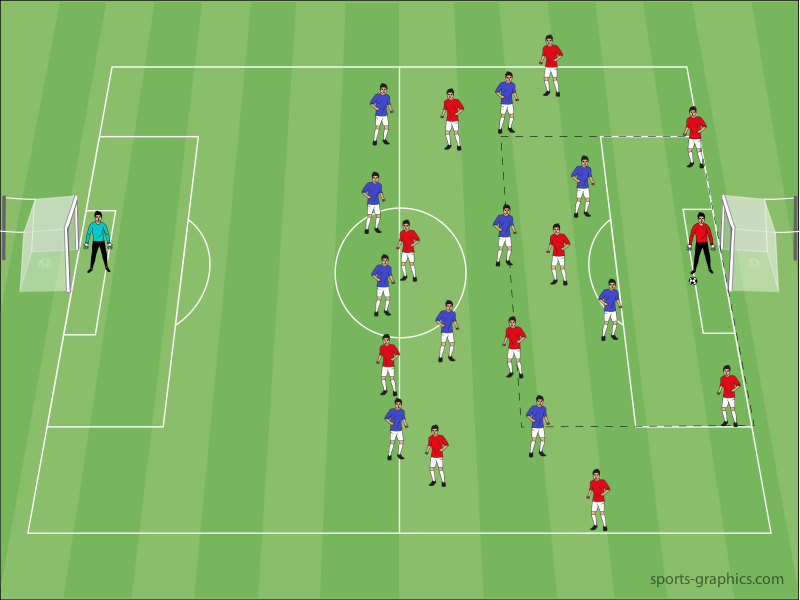 übermäßig wenige. Hierbei eignet sich insbesondere eine ausgeglichene Aufstellung im System 4-3-2. Das liegt daran, dass bei diesem Spielsystem genügend Spieler vorhanden sind, um das Druckspiel durchzuführen, aber im Falle eines Scheiterns sind noch immer genügend Innenverteidiger zur Stelle, um als Absicherung zu dienen.