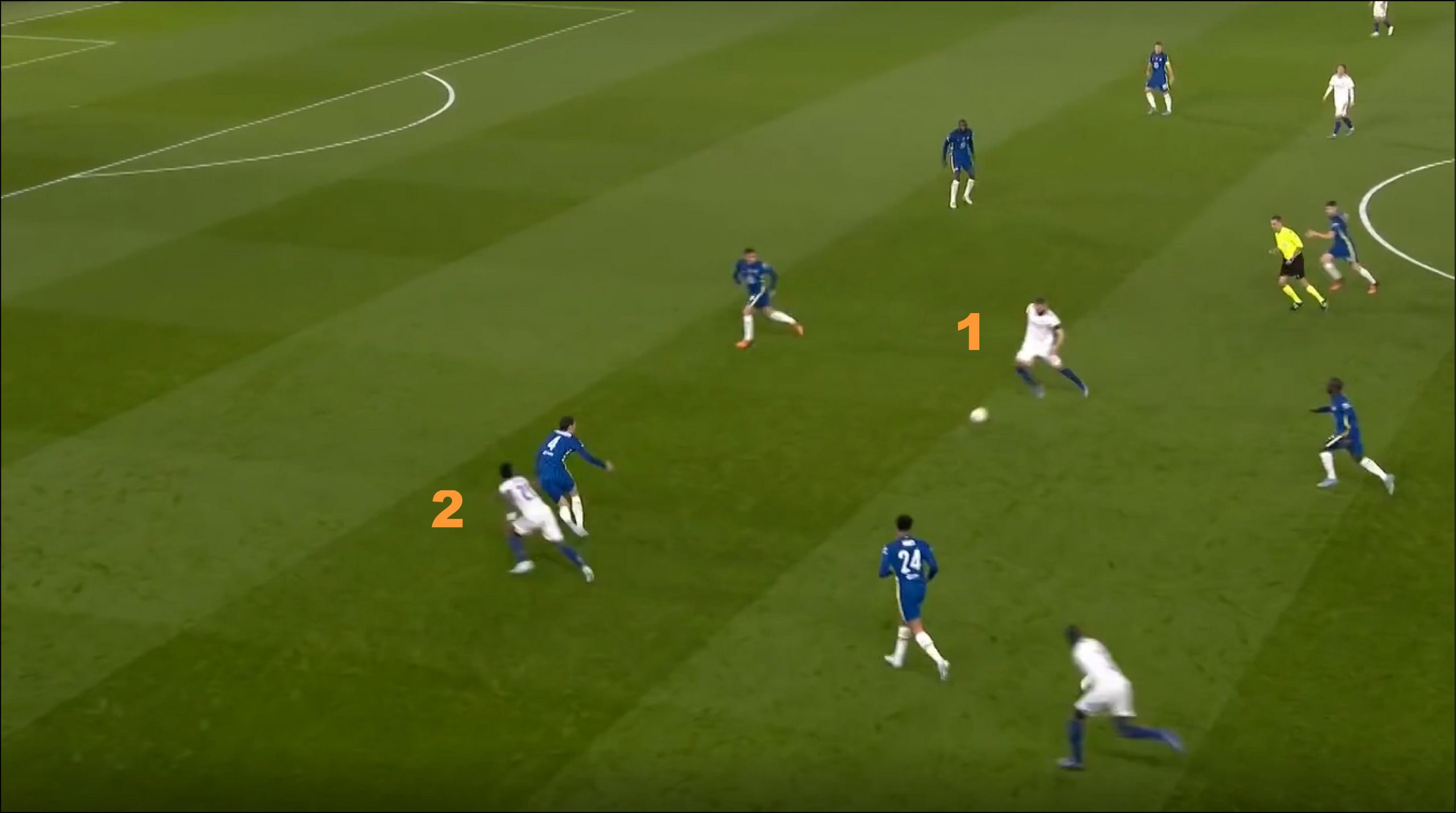 Modric (1) erkennt, dass Benzema (2) aussichtsreich positioniert ist und flankt den Ball sofort aus dem Halbraum über Thiago Silva hinweg. Dieser ist völlig überrumpelt und kann Benzema nicht mehr folgen, welcher gekonnt zum 2:0 einköpft.