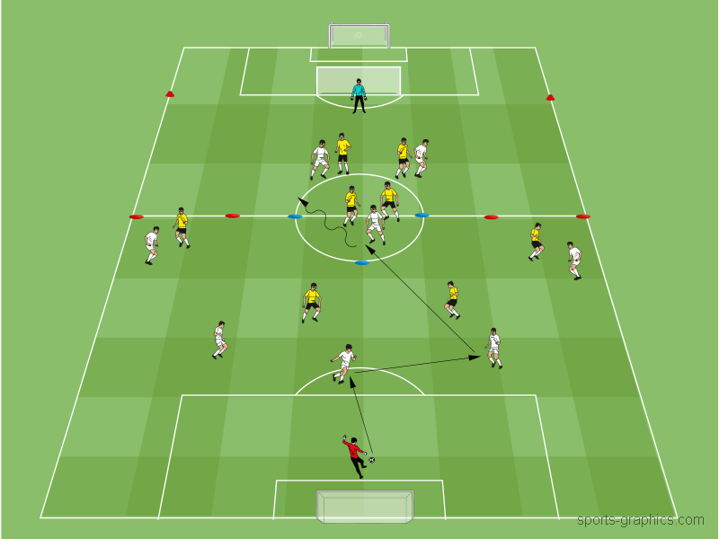 Am Beispiel eröffnet der Torhüter auf den zentralen Innenverteidiger das Spiel. Ziel ist es, nach Durchspielen eines der vier Tellertore – 2x rot am Flügel, 2x blau im Zentrum – auf das Tor abzuschließen. Nach Abschluss der offensiven Mannschaft eröffnet der Torhüter des Coaching-Teams wieder das Spiel. Bei Balleroberung darf das Sparring-Team auf das Tor abschließen.