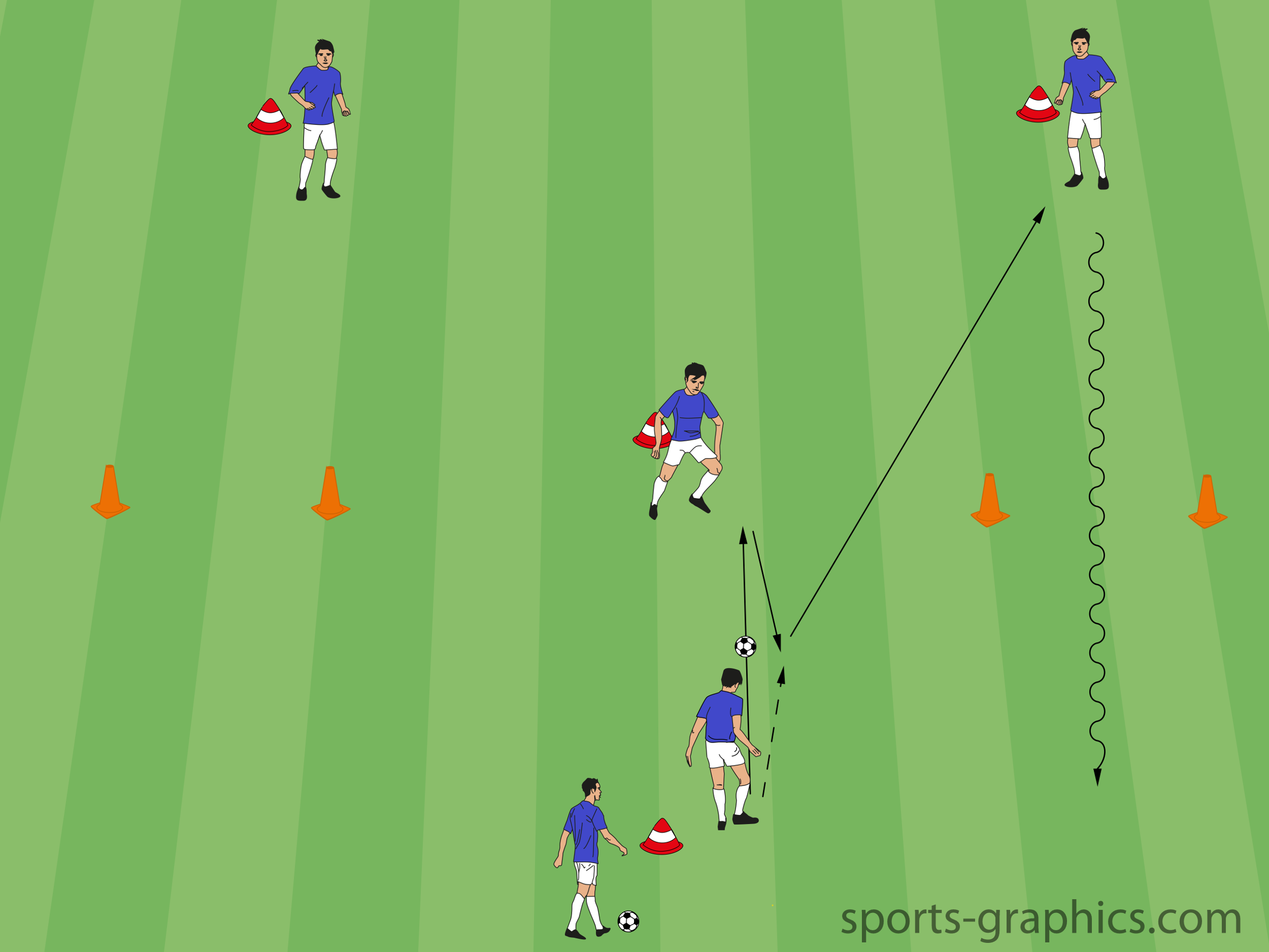 Die Übung beginnt mit einem flachen Pass von Spieler 1 auf Spieler 2. Dieser lässt den Ball direkt auf den 1. Spieler klatschen. Spieler 1 hat nun 2 Kontakte, um den Ball zu verarbeiten und weiterzuspielen. Mit dem 1. Kontakt nimmt er ihn an und mit dem 2. Kontakt passt er den Ball scharf und flach auf den Spieler, der sich von ihm aus diagonal rechts befindet. Der Spieler, der nun angespielt wird, nimmt den Ball nach vorne in die Bewegung mit und dribbelt in höchstem Tempo durch das auf seiner Seite stehende Pylonentor. Im nächsten Übungsdurchlauf wird nun die linke Seite angespielt. Dabei ist darauf zu achten, dass die Spieler während des Passspiels und im Dribbling beide Füße benutzen und trainieren.