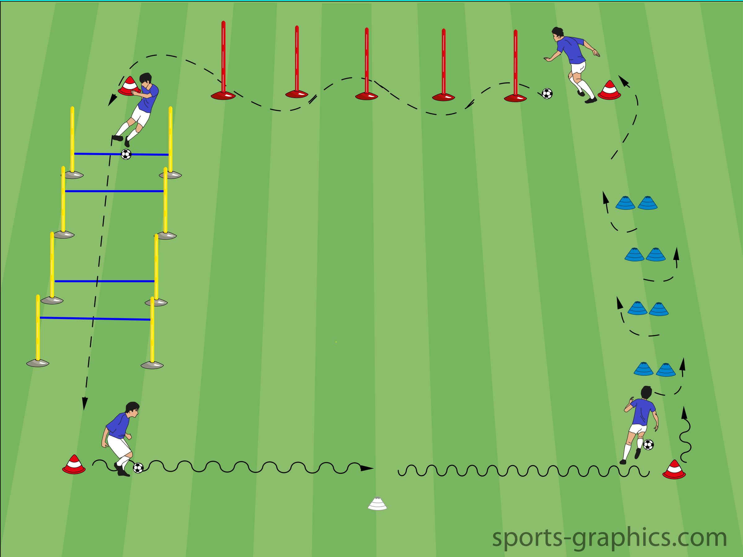 Zu Beginn verteilen sich die Spieler gleichmäßig an den Eckpunkten des Parcours. An der 1. Station bewegen sich die Spieler mit schneller Beinarbeit (Ball-Pendeln) 1 Strecke vorwärts und die 2. Strecke rückwärts. Angekommen an der 2. Station, müssen die Spieler den Ball mit der Sohle nach links und nach rechts vor den Hütchen zur Seite nachziehen. An der 3. Station sind 4 Stangen aufgebaut, welche die Spieler mit einem Slalomdribbling im hohen Tempo überwinden. Bei der 4. und letzten Station des Parcours sind je 2 Stangen mit elastischen Hürdenbändern in verschieden Höhen verbunden. Liegt das Hürdenband tief, so wird der Ball temperiert durchgepasst, über das Band gesprungen und wieder aufgenommen. Bei hoch befestigten Hürdenbändern müssen die Spieler darunter durchdribbeln.