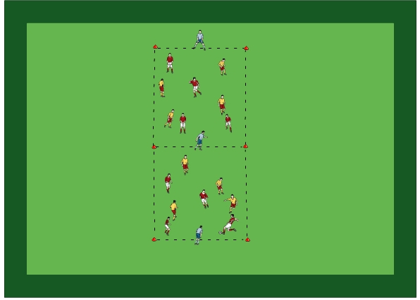 Nach der kurzen Erwärmung wurde die Gruppe in 2 Teams plus 3 neutralen Spielern eingeteilt. Das Team mit Leibchen bestand dabei aus 7 Spielern, das ohne Leibchen aus 6 Spielern und das neutrale 3er-Gespann aus 2 Torhütern und einem Co-Trainer. In einem Feld, das ca. so groß wie der 16-Meter-Raum war, wurde nun insgesamt ca. 30 Minuten auf Ballhalten gespielt. Die Zahl der Ballkontakte sollte dabei möglichst auf max. 2 beschränkt bleiben.