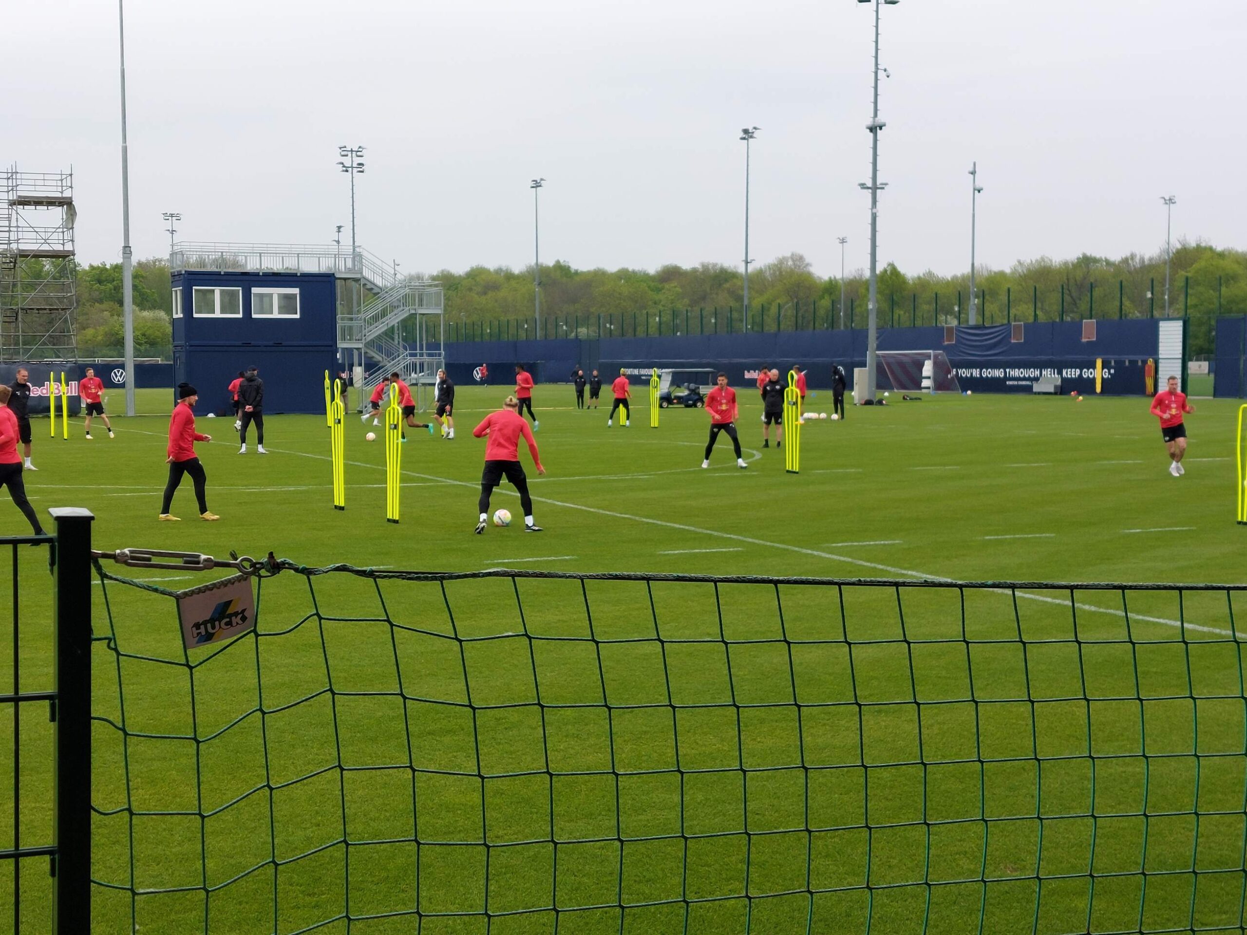 RB Leipzig Taktik: Im Training wurde das Rauslocken der gegnerischen Verteidigung und das Raum-aufreißen geübt. Diallo, Laimer und Olmo fehlten, Gvardiol trainierte etwa eine halbe Stunde allein. Während sich die anderen Feldspieler mit ABC-Läufen und einfachen Passstafetten warm machten, trainierte Gvardiol mit einem Co-Trainier seine Beweglichkeit am Ball und wird wohl nach dem Ausfall gegen Freiburg aufgrund einer muskulären Verletzung langsam wieder ans Team herangeführt.