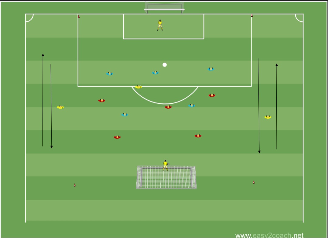 Die Außenspieler derselben Mannschaft standen sich diagonal gegenüber, sodass beide Mannschaften mindestens einen Spieler in Tornähe hatten. Es gab auf jeder Seite zwei kleine Tore. Ziel war es, zehn Pässe zu spielen, wobei jeder Spieler nur zwei Ballkontakte haben durfte, und erst, wenn beide Außenspieler einen Pass gespielt hatten, durfte das Tor gemacht werden.
