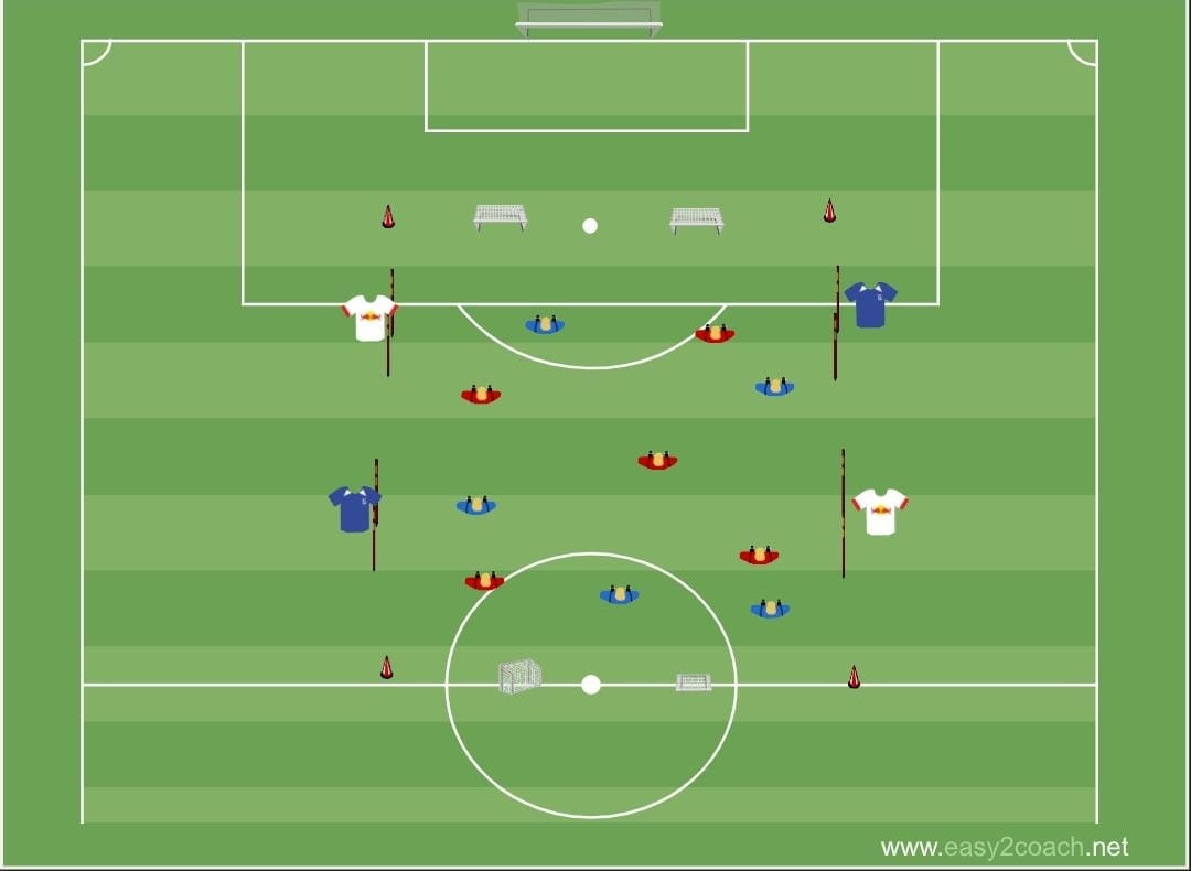 Auch die nächste Übung kommt beim öffentlichen Training schon zum zweiten Mal vor: Die Außenspieler derselben Mannschaft standen sich an den Seitenlinien diagonal gegenüber, sodass beide Mannschaften mindestens einen Spieler in Tornähe hatten. Es gab auf jeder Grundlinie zwei kleine Tore. Ziel war es, zehn Pässe zu spielen, wobei jeder Spieler nur zwei Ballkontakte haben durfte, und erst, wenn beide Außenspieler einen Pass gespielt hatten, durfte das Tor gemacht werden.