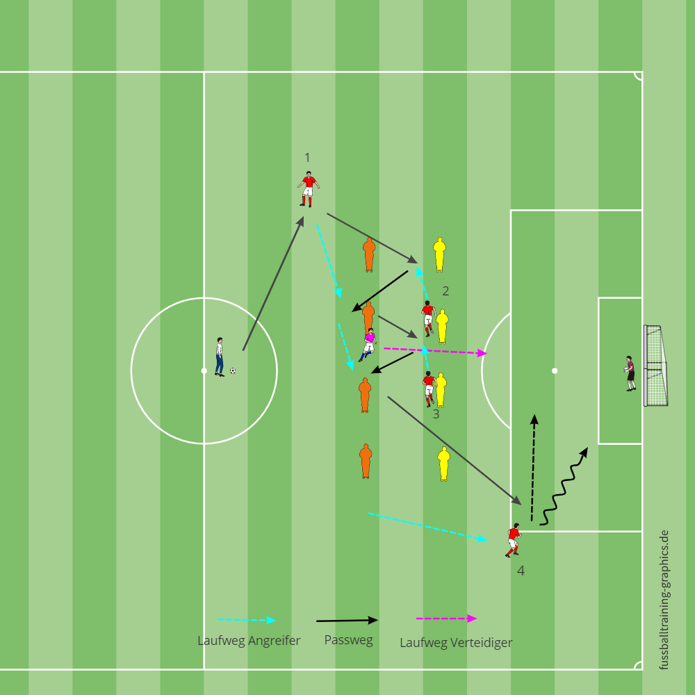 Ausgehend von Trainer wurde der Ball auf die linke Außenposition (1) gespielt. Der Außenspieler sollte mit Zug ins Zentrum den Stürmer (2) direkt anspielen. Dieser löste sich zeitgleich vom Gegenspieler (gelber Dummy) um den Ball direkt zurück zu spielen. Der Außenspieler (1) suchte dann erneut einen Stürmer (3) im Zentrum, welcher sich ebenfalls von einem Dummy löste um die Doppelpassaktion zu wiederholen. Anschließend sollte ein Ball in die Tiefe auf die rechte Außenposition (4) gespielt werden.