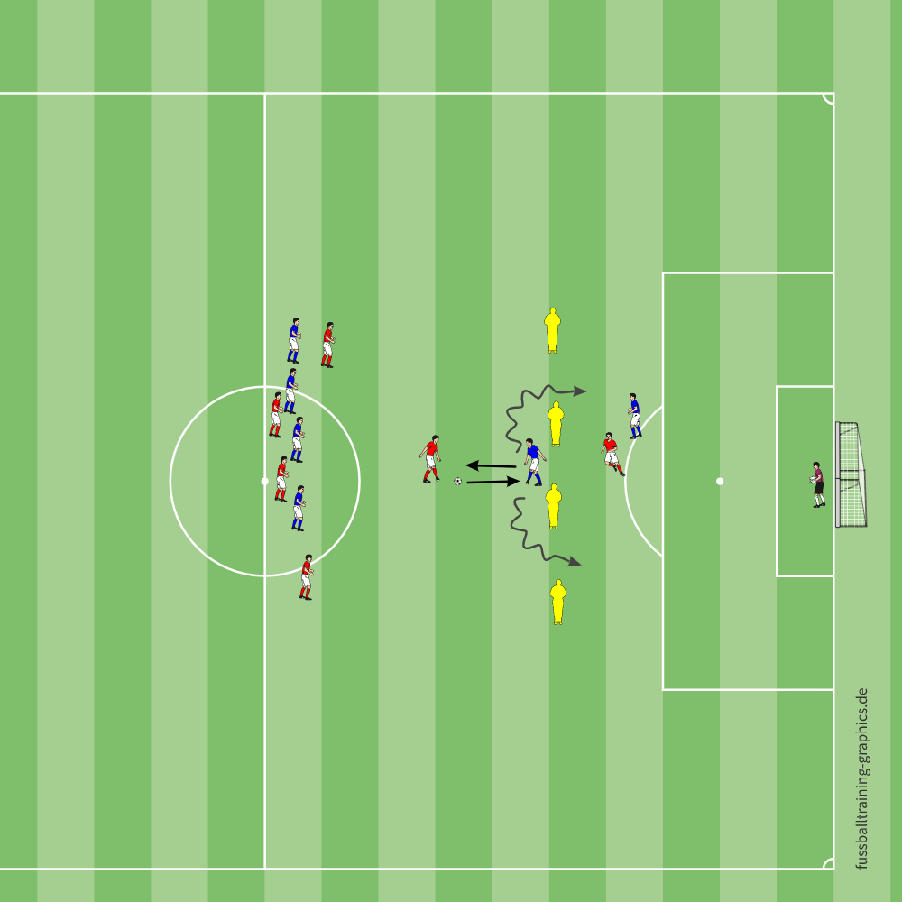 In der abschließenden Übung sollten die Athleten in einem 2 gegen 2 zum Torerfolg kommen. Zunächst spielten sich zwei Spieler hinter einer Reihe von Dummys direkte und scharfe Pässe zu. Nach maximal 4 Pässen entscheidet sich der Stürmer schnellkräftig aufzudrehen und einen direkten Weg zum Tor zu finden und zum Abschluss zu kommen oder wahlweise den Querpass auf seinen Mitspieler zu suchen.
