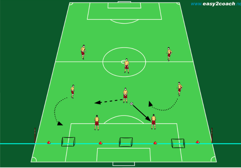 Der Trainer machte den Angriff auf bestimmte Positionen des Balls aufmerksam, die alle Passoptionen offenhält, sodass die Mitspieler des Ballführenden jederzeit in Erwartung auf einen schnellen Angriff und die Möglichkeit, selbst den Ball zu erhalten, sein müssen. Eine mögliche Position hierfür deutete er in der Mitte der Abwehr an (in der Grafik ca. 3 Meter vor dem mittleren kleinen Tor).