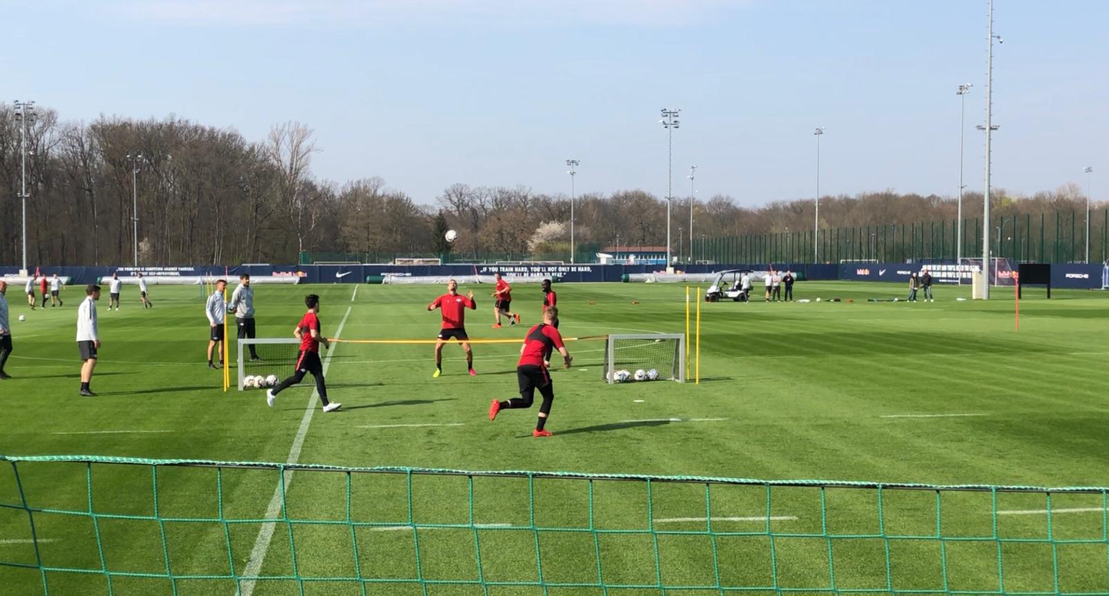 Mit 10 Minuten Verspätung kamen die Reservisten und der Anschlusskader zum Spielersetztraining. Bei 15 Grad und strahlender Sonne ging es für die übrig gebliebenen Profis auf das frisch bewässerte Grün. Nach der Einlauf Runde und der Begrüßung der Fans ging es nun an das etwa 15 bis 20-minütige Warm-Up-Programm.